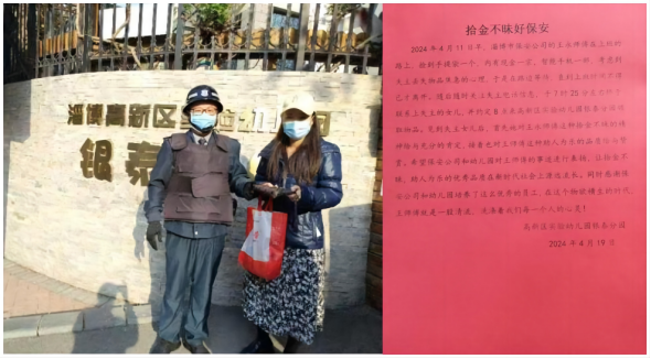 4月11日,市保安公司高新區(qū)銀泰城幼兒園項目部保安隊員王永上班路上撿到手提袋一個,四處找尋無果后,打開查看包內(nèi)有手機和少量現(xiàn)金,通過電話聯(lián)系找到失主,最終歸還遺失物品。失主家人拿到失而復(fù)得的財物后,十分激動并專門送上感謝信對其表示感謝。