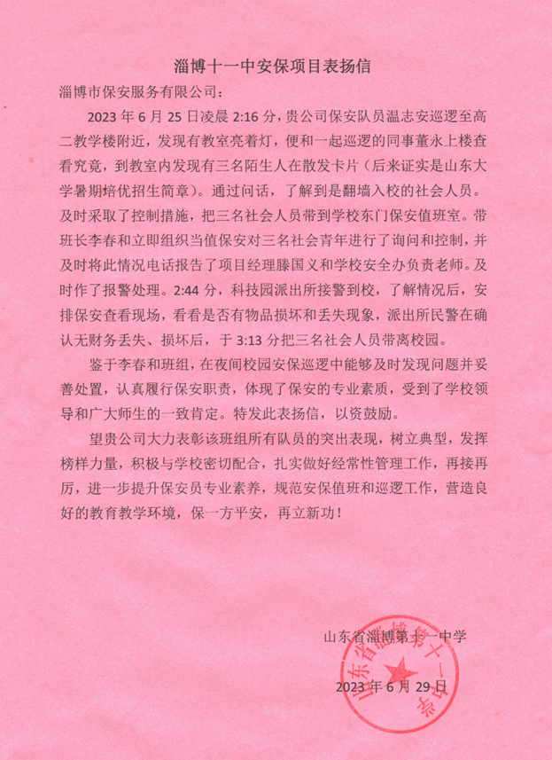 6月29日市保安公司駐淄博市第十一中學(xué)崗點收到學(xué)校送來的一封感謝信。信中對保安隊員溫志安、董永以及班長李春和項目負責人滕國義提出表揚。6月25日凌晨2時16分,派駐淄博第十一中學(xué)保安隊員溫志安、董永巡邏至高二教學(xué)樓附近發(fā)現(xiàn)有三名陌生人在散發(fā)卡片(后來證實是山東大學(xué)暑期培優(yōu)招生簡章)。通過問話,了解到是翻墻入校的社會人員,及時采取了控制措施,班長李春和及時將此情況電話報告了項目負責人滕國義和學(xué)校安全辦負責老師,并及時作了報警處理。2時44分,科技園派出所接警到校,了解情況后,確認無財物丟失、損壞后,于3時13分把三名社會人員帶離校園。為表彰先進、弘揚正氣,在保安隊伍中積極營造干事創(chuàng)業(yè)、爭先創(chuàng)優(yōu)的良好氛圍,7月11日上午,對以上四名同志作出相對應(yīng)的現(xiàn)金獎勵,十一中校領(lǐng)導(dǎo)和公司項目負責人召開專題會議共同為隊員進行了表彰。“平凡崗位,點滴熱忱”李春和班組,在夜間校園安保巡邏中能夠及時發(fā)現(xiàn)問題并妥善處置,認真履行保安職責,不僅體現(xiàn)了市保安公司保安隊員的專業(yè)素質(zhì),而且為其他保安隊員樹立了學(xué)習的榜樣。