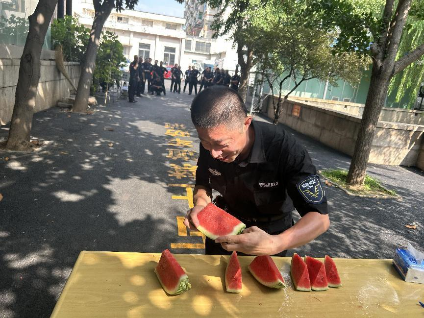 活動(dòng)設(shè)有“大象轉(zhuǎn)圈”、“吃西瓜比賽”等項(xiàng)目,隊(duì)員們以車(chē)組為單位進(jìn)行了激烈的角逐,大家一邊享受比賽的激情一邊品嘗西瓜的清爽,樂(lè)趣無(wú)窮。最終有兩組隊(duì)伍獲得優(yōu)勝獎(jiǎng),隊(duì)長(zhǎng)張波將清涼解暑的冷飲送到獲獎(jiǎng)隊(duì)員手中,同時(shí)叮囑大家注意飲食,適當(dāng)補(bǔ)充淡鹽水,不要貪涼,保持夏季健康,以最好的狀態(tài)投入勤務(wù)工作。